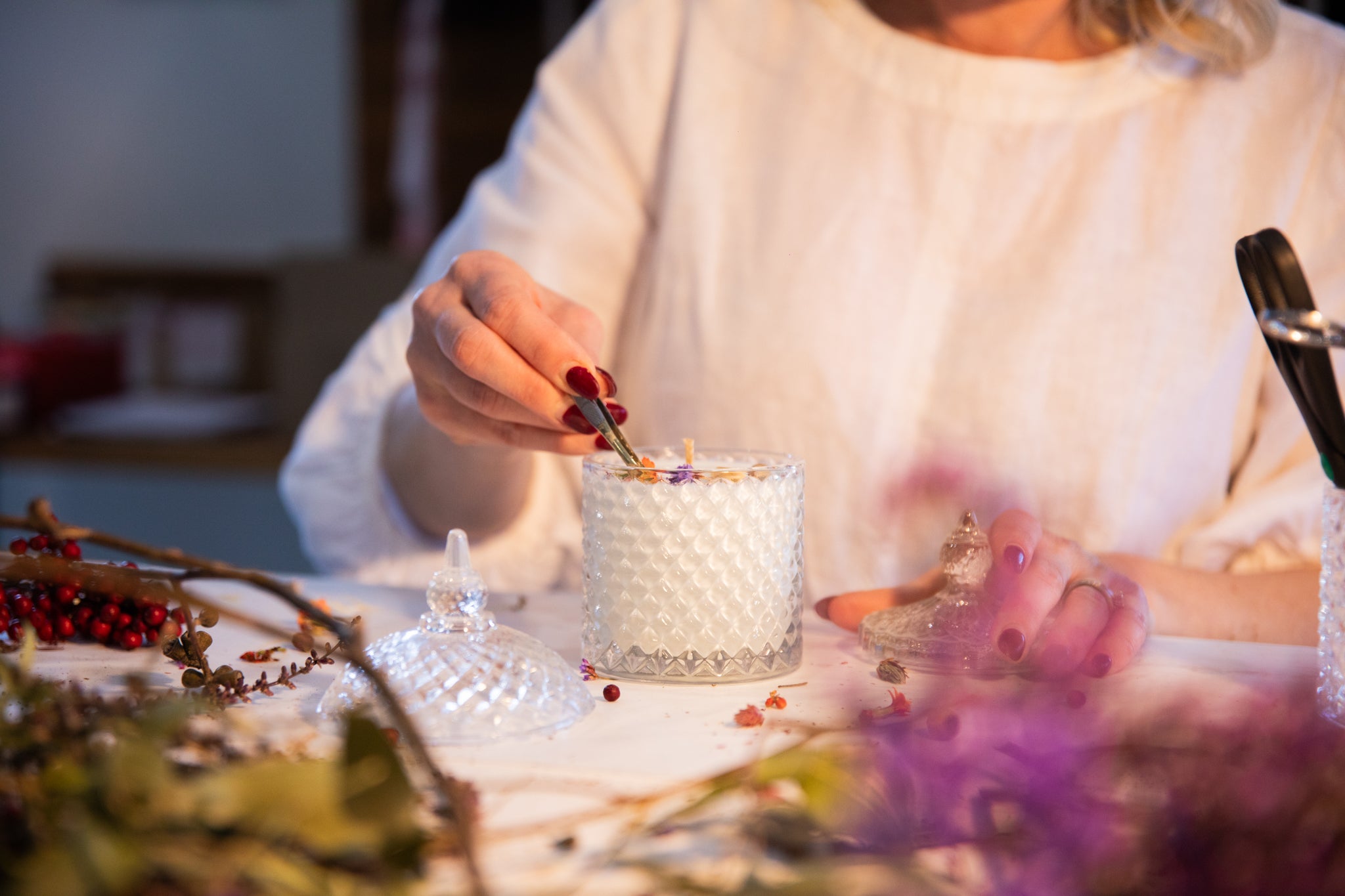 All our candle top decorations are biodegradable, even the glitter. We use non-toxic, eco-friendly glitter to adorn the tops of our candles. Additionally, our candles are decorated with items from nature, such as flowers and seeds, emphasising their natural and safe composition. This ensures that our decorations are as gentle on the environment as they are beautiful. Additionally, every candle comes with a lid to prevent dust from settling in the wax, maintaining their quality and cleanliness.